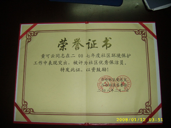 我司黄可云同志被评为社区优秀保洁员